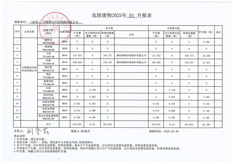 日照磐岳环保科技有限公司危险废物产生2025年1月份报表|日照磐岳环保科技有限公司-完美世界电竞官网
