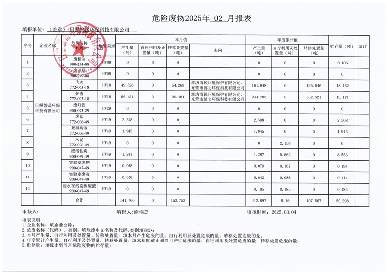 日照磐岳环保科技有限公司危险废物产生2025年2月份报表|日照磐岳环保科技有限公司-完美世界电竞官网