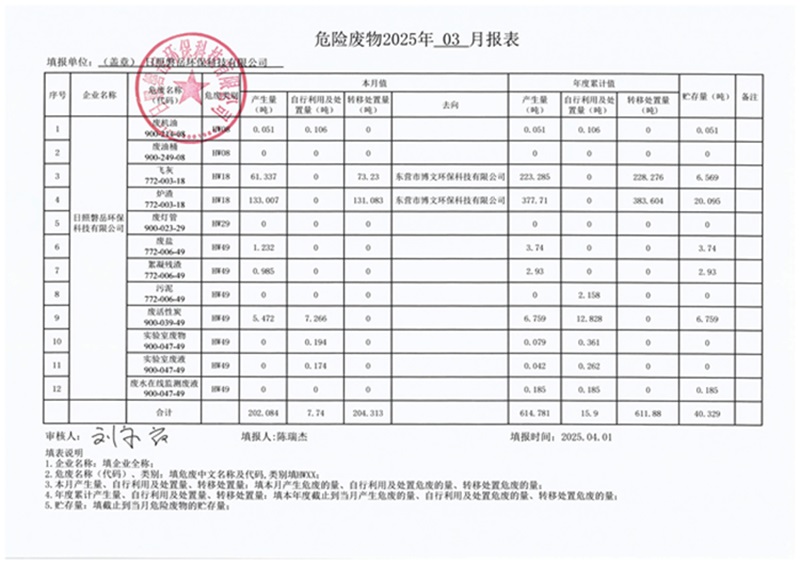 日照磐岳环保科技有限公司危险废物产生2025年3月份报表|日照磐岳环保科技有限公司-完美世界电竞官网
