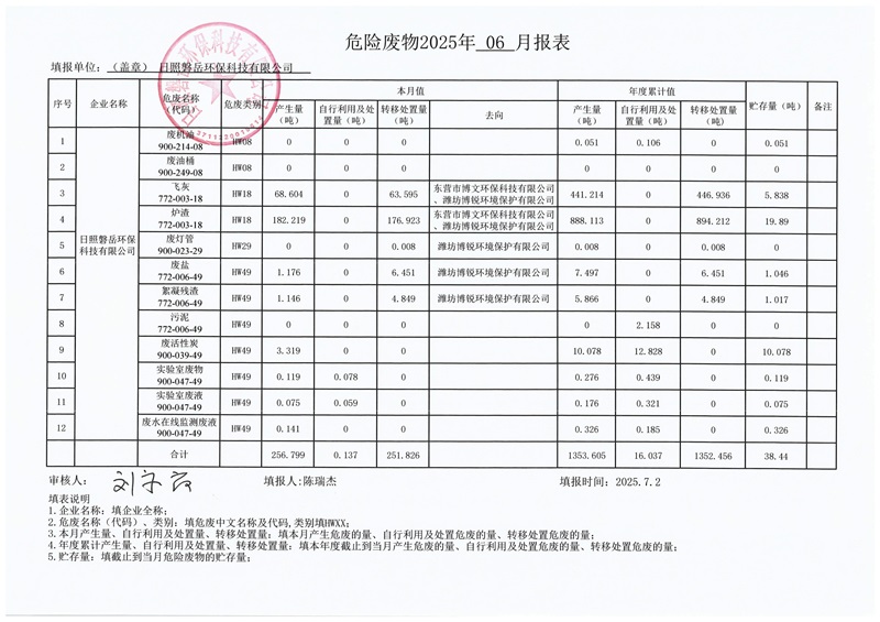 危险废物产生2025年6月份报表|日照磐岳环保科技有限公司-完美世界电竞官网