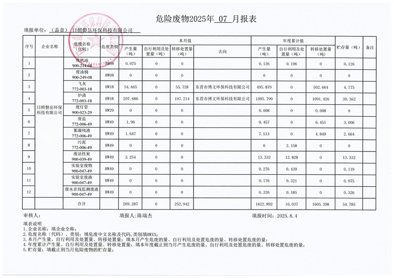 危险废物产生2025年7月份报表|日照磐岳环保科技有限公司-完美世界电竞官网
